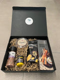 Cadeaupakket met honey rosted peanuts, grissini, barritas de pipas, mango-curry dip en Grinder met zout dat geïnfuseerd werd met rode wijn.
